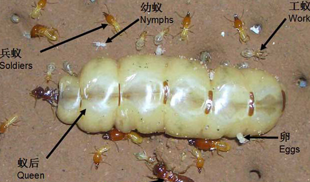 兵蟻是白蟻群體中變化較大的品級(jí),除少數(shù)種類(lèi)缺兵蟻外,一般從3-4齡幼蟻開(kāi)始,部分幼蟻分化為色澤較淡的前兵蟻,進(jìn)而成為兵蟻,是群體的防衛(wèi)者,雖有雌雄之分,但不能繁殖,頭部長(zhǎng)而高度骨化,上顎特別發(fā)達(dá),但已失去了取食功能,而成為御敵的武器,還可用上顎堵塞洞口、蟻道或王宮入口,由于失去了取食功能,因而食物由工蟻飼喂。